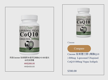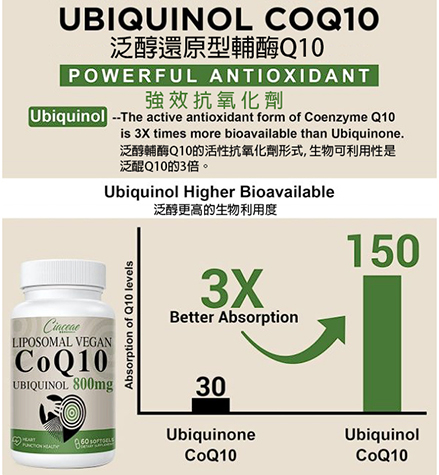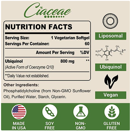 每粒 Ciaceae Ubiquinol CoQ10 膠囊含有 800mg 純 CoQ10 並具有雙效力,比Ubiquinone形態更具生物活性,更容易被人體吸收,生物利用率高出3倍。
